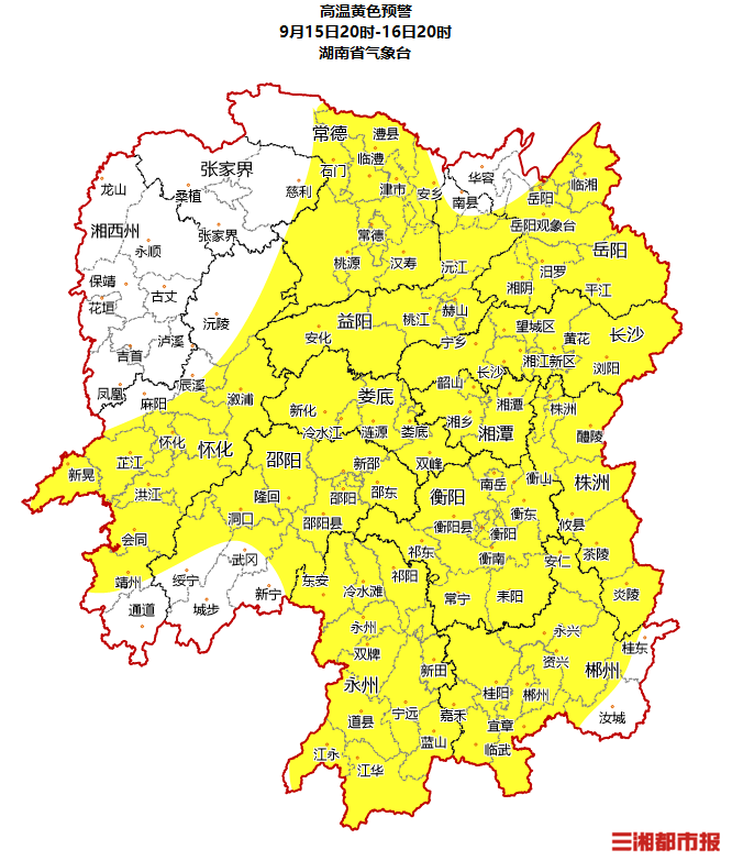 三湘都市报9月15日讯(全媒体记者 李致远)湖南省气象台9月15日发布高温黄色预警:预计16日白天,全省大部分地区有35℃以上高温,其中长沙、株洲、湘潭、衡阳、永州北部、郴州北部局部地区将达37℃以上,请做好防范。