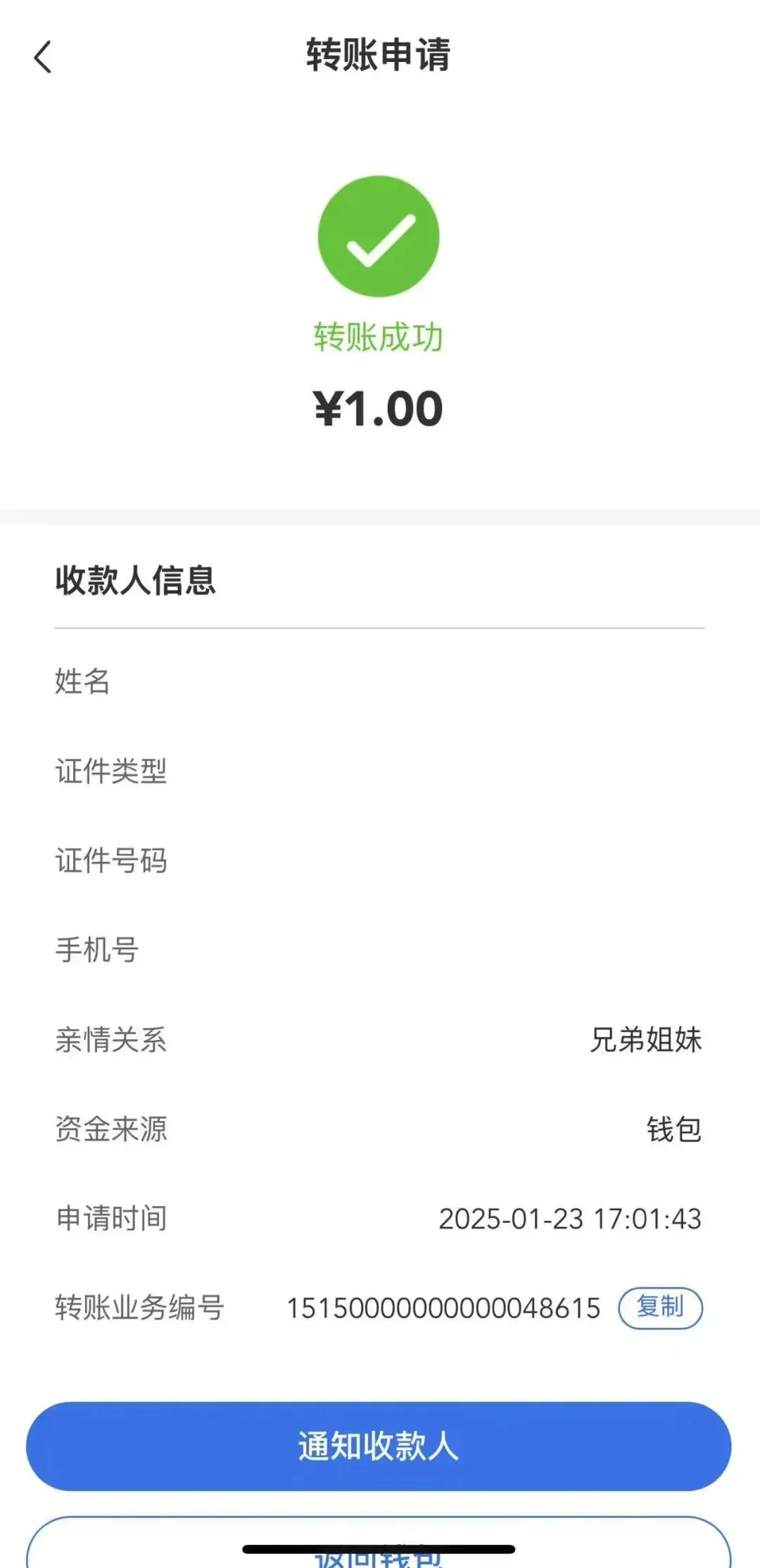 若被转账人未及时接收钱包转账,则发出的金额将在次日6:00退回转账人账户内: