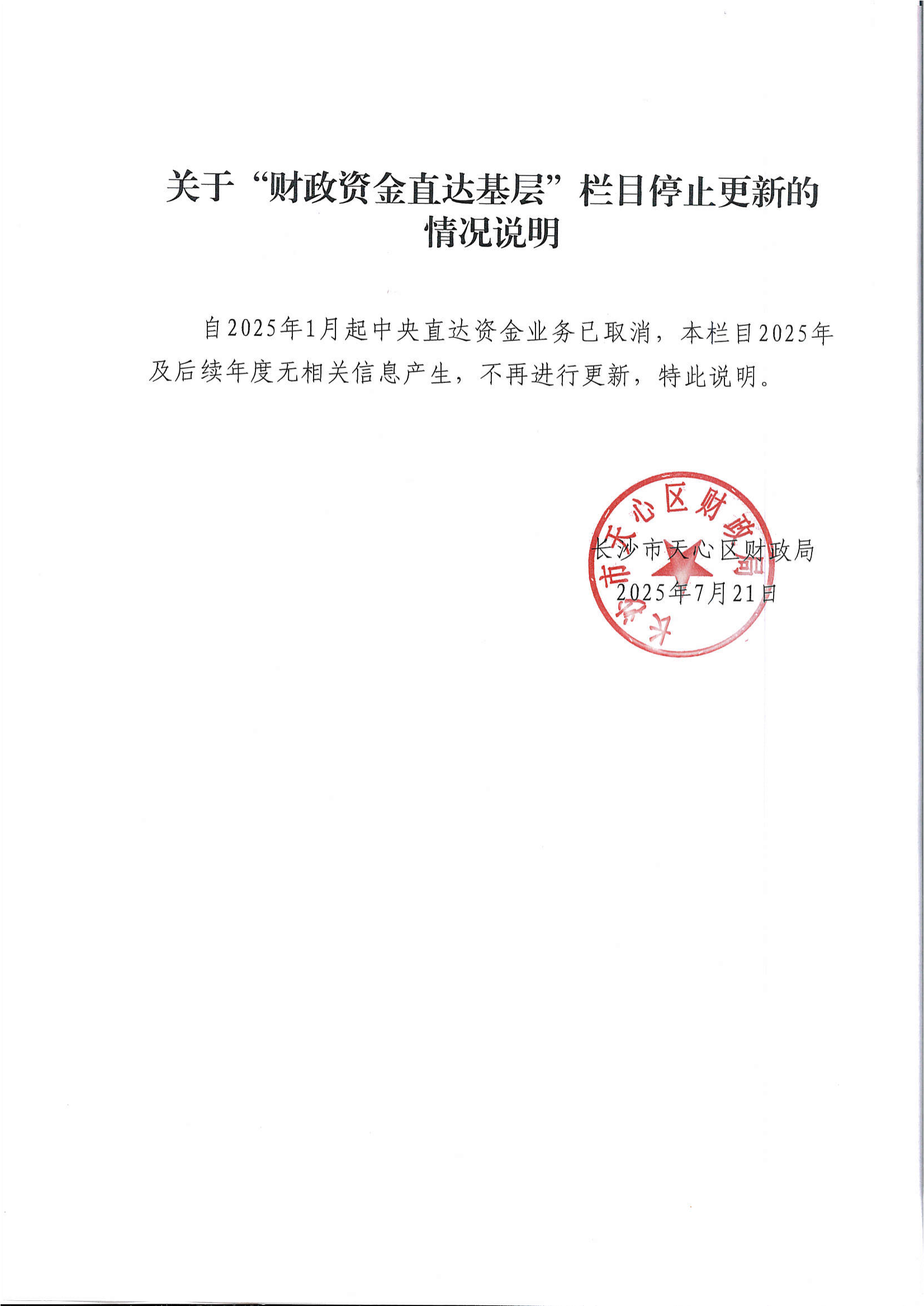 关于“财政资金直达基层”栏目停止更新的情况说明