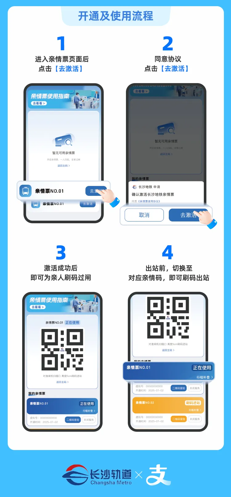 用户只需在支付宝上点击“出行”选择地铁码“长沙地铁/磁浮乘车码”,点击页面下方菜单栏“亲情票”,进入长沙地铁“亲情票”页面。之后点击“去激活”,生成专属副码。进、出闸机前,在“亲情票”页面切换至对应人员二维码,一人一码依次过闸,建议主码持有者最后过闸,避免漏刷。